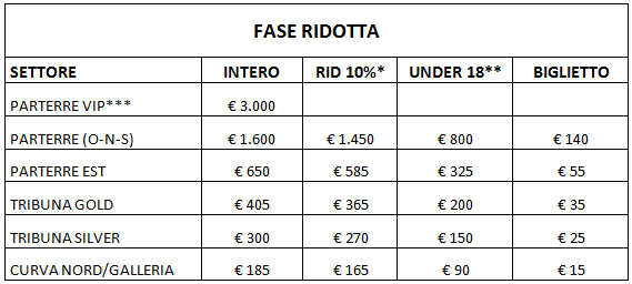 - FASE RIDOTTA dal 7 al 23 luglio: TARIFFA RIDOTTA con PRELAZIONE per I VECCHI ABBONATI mantenendo il proprio posto. Nel corso della fase ridotta i vecchi abbonati della stagione regolare possono esercitare il diritto di prelazione sul proprio posto. In questa fase anche i nuovi abbonati potranno sottoscrivere la propria tessera usufruendo della tariffa ridotta e scegliendo tra i posti non soggetti a prelazione.