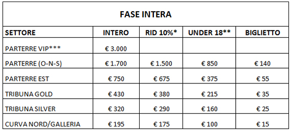 - FAMILY ZONE: agevolazioni studiate per le famiglie nei settori di TRIBUNA GOLD OVEST e TRIBUNA SILVER, le nostre “Family Zone”. I nuclei familiari composti da 4 o più persone (di cui 2 devono essere minorenni) nei settori di TRIBUNA GOLD OVEST e TRIBUNA SILVER potranno usufruire del “pacchetto famiglia” che prevede la tariffa ridotta per gli adulti e la speciale tariffa di 80 euro nella prima fase e 95 euro nella seconda fase per ognuno dei figli minori. (Se i figli hanno meno di 6 anni l’ingresso è gratuito senza assegnazione di posto a sedere).